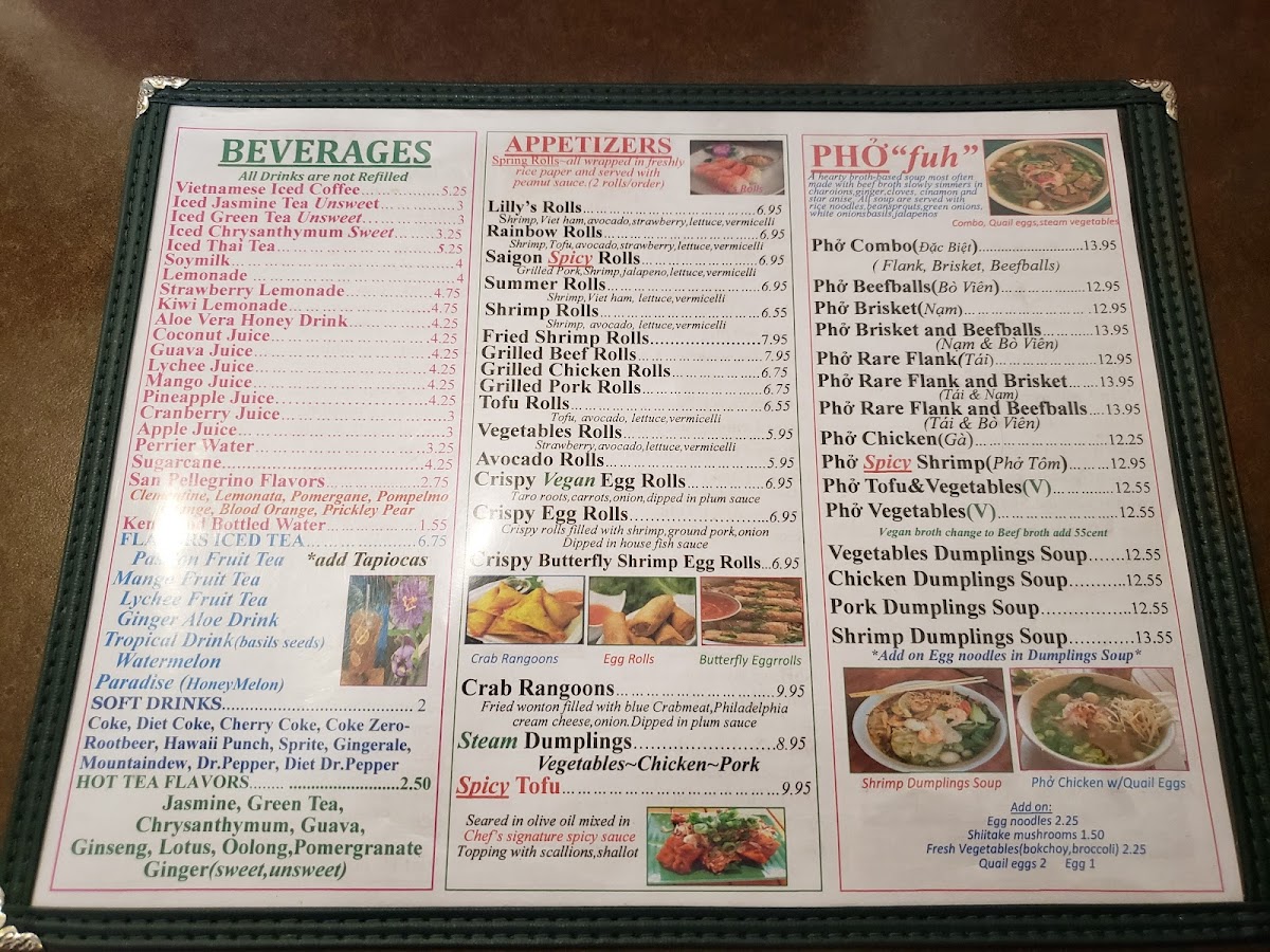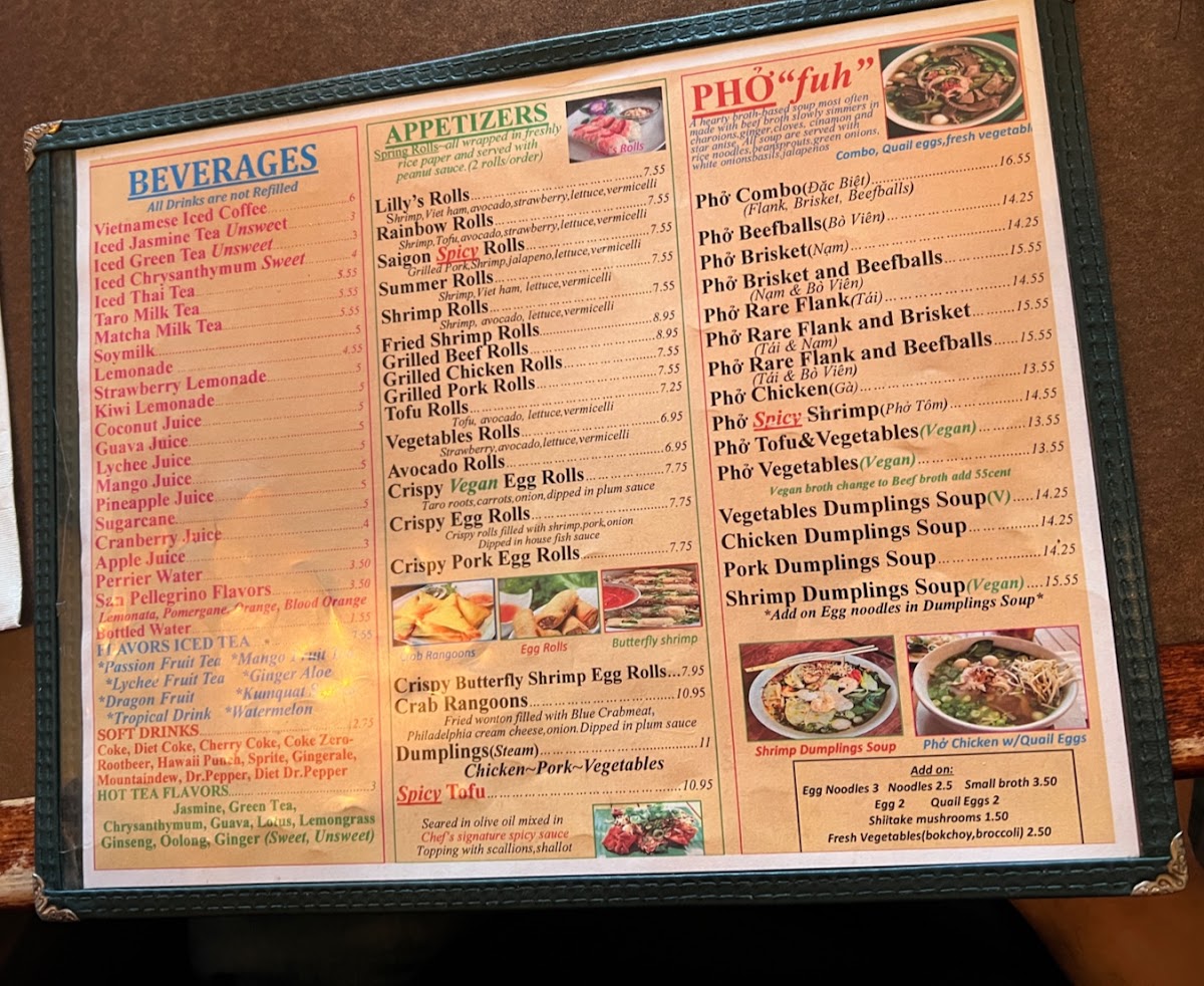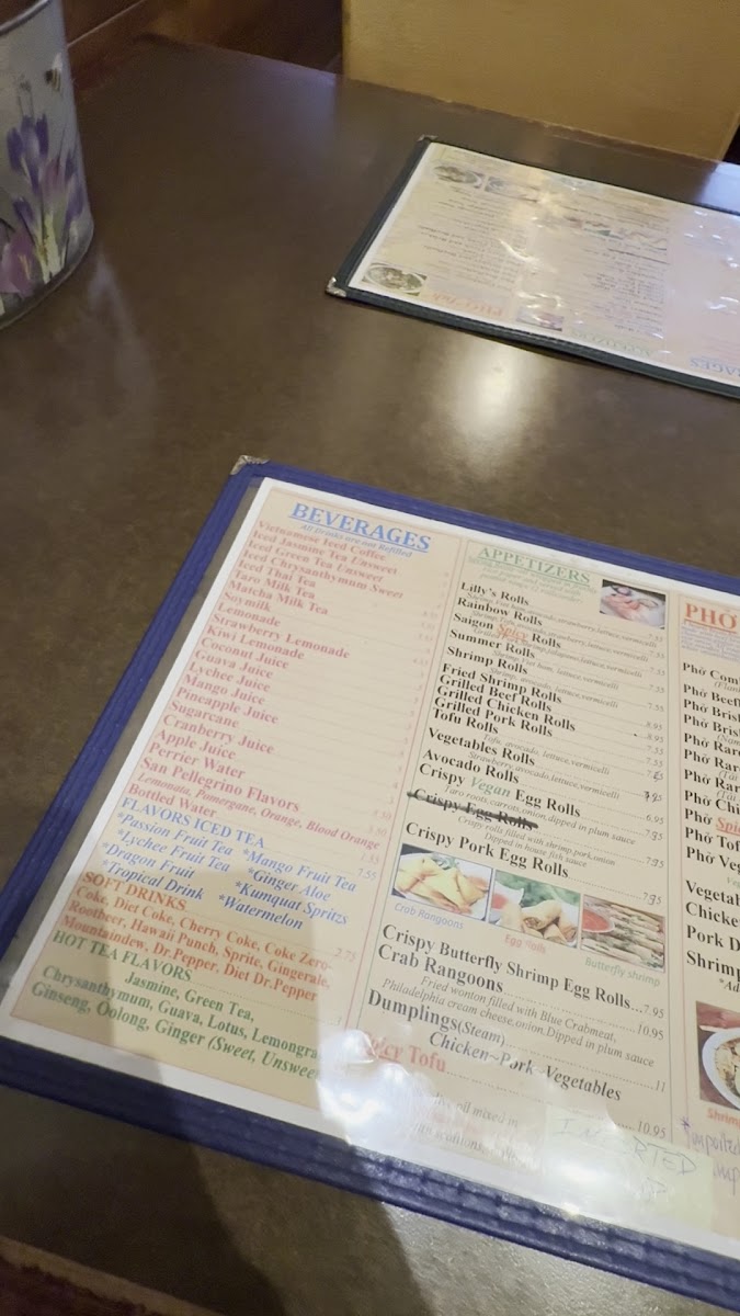 Beverages available include hot and iced teas, soft drinks, and a variety of fruit juices such as pineapple, guava, lychee, and cranberry. Specialty drinks like Vietnamese iced coffee and iced Thai tea are also part of the offering, making the beverage menu suitable for pairing with meals or enjoying during a casual break.